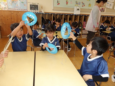 三角の周りを、スニーカーの靴紐のように両方から順番にヒモを通し、お友達と話をしながら楽しそうに取り組む事が出来ました。